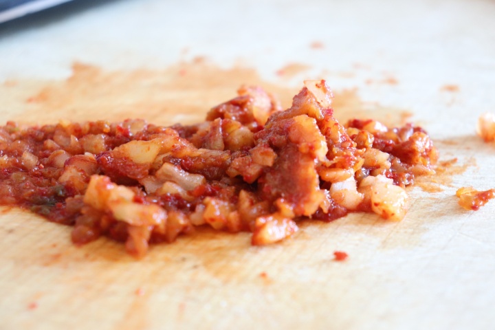 白菜キムチを細かく刻み、盛り付ける。