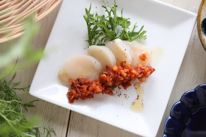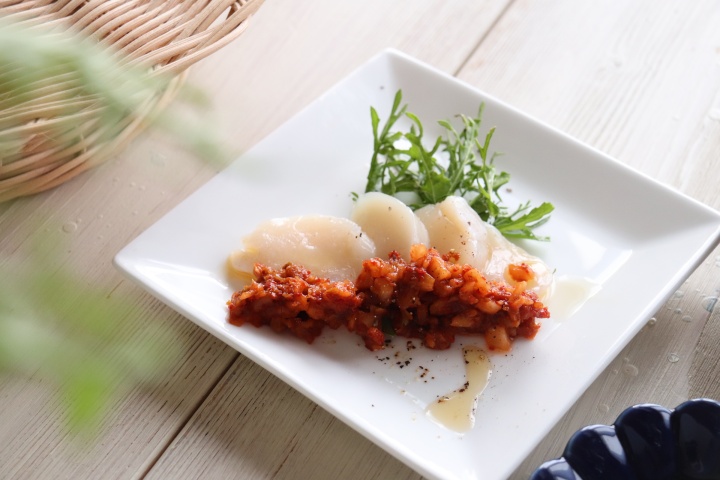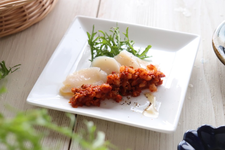海鮮とキムチは好相性。お刺身のたれをキムチに替えて胡麻油をたらし、贅沢な一品に。濃厚なホタテがキムチの辛味と旨味で一段と美味しくいただけます。