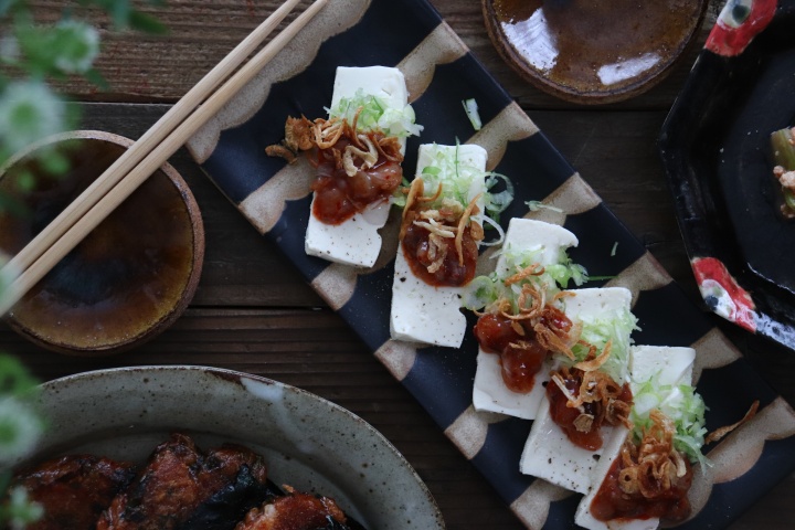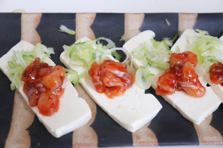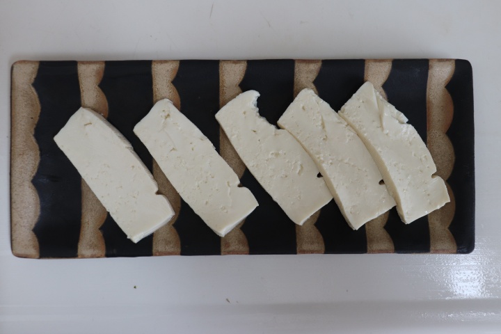木綿豆腐はしっかり水切りして五等分にスライスし、皿に盛る。