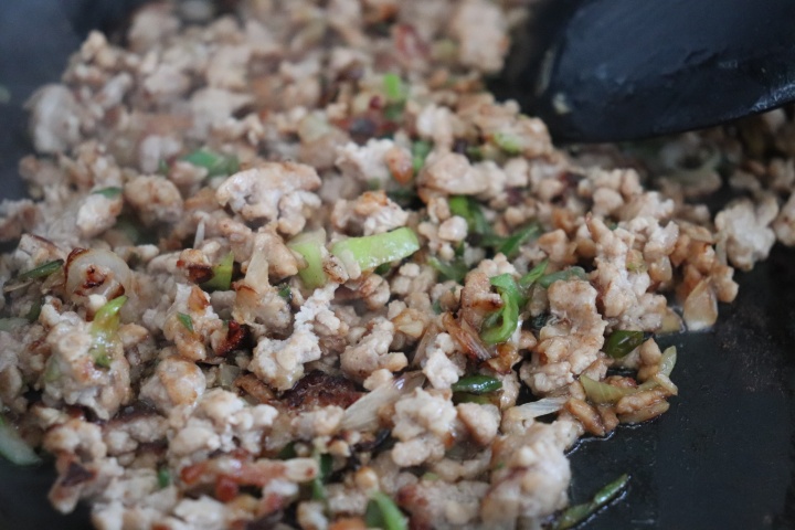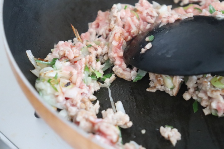 フライパンでガーリックオイルを熱し、みじん切りにしたねぎを炒め、香りが出てきたら豚ひき肉も加えて炒める。