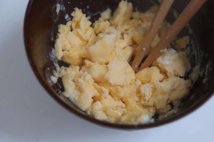 (炒り卵を作る)卵を溶きほぐし、砂糖と塩を加えてラップはせず電子レンジで1分加熱する。(600W)