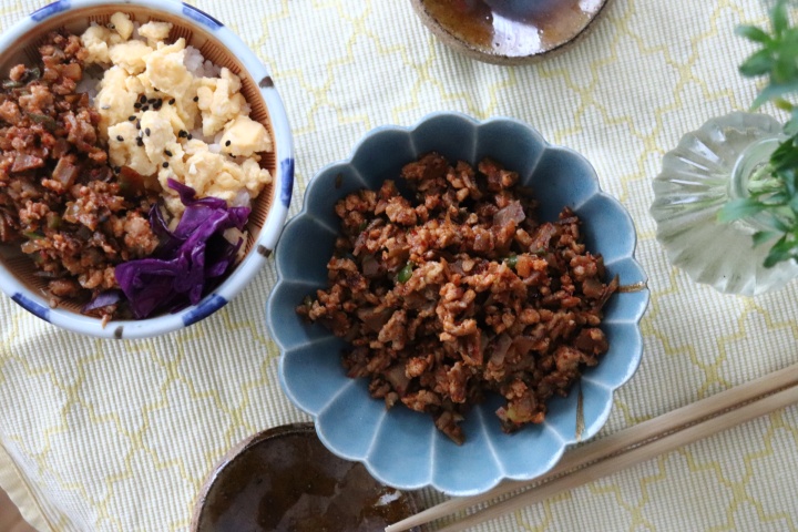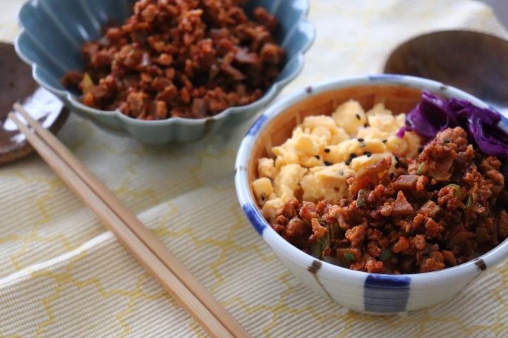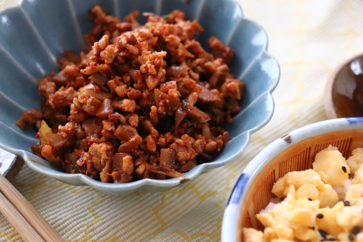 そんな作り置きにもピッタリなそぼろをキムチと合わせたらご飯が進むおかずに。