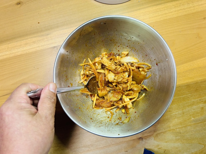 キムチ、松の実を加えて混ぜる。できれば30分ほどおいて味をなじませる。