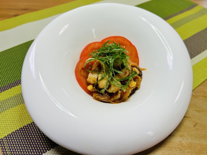 ボールでカットした鶏皮、タマネギ、バルサミコ、干しブドウ、醤油を良くあえる。