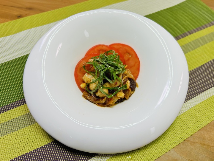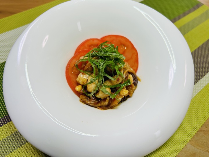 器にお好みの飾り野菜とともに盛って、ヴァージンオイルを振りかける。