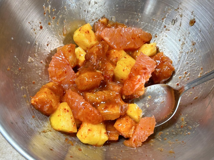 ボールで山芋キムチ、パイン、グレープフルーツ、ゆずジャムをさっくりと混ぜ合わせる。