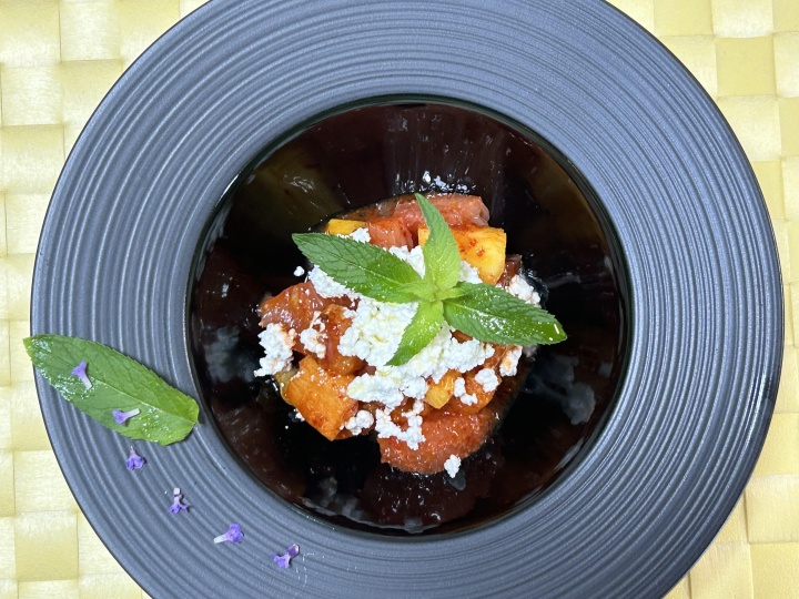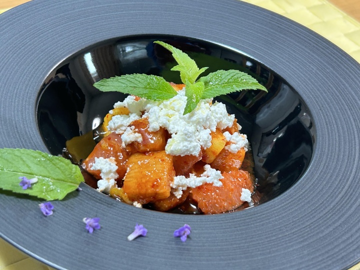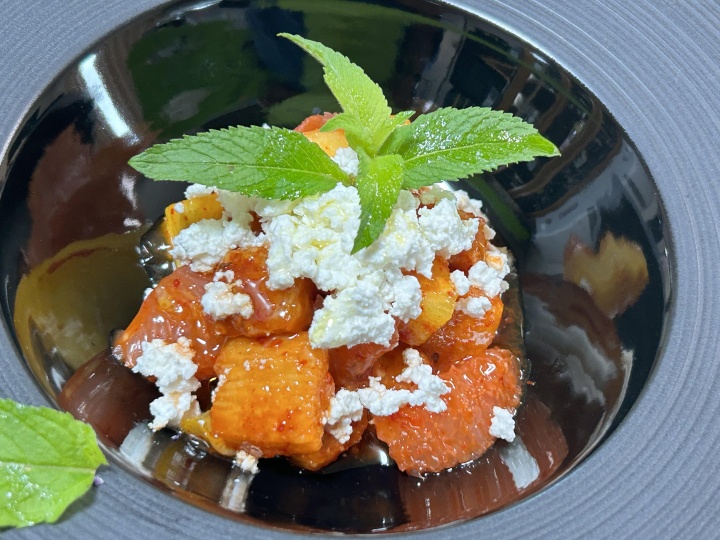器に盛り、カッテージチーズ、ヴァージンオイルを振り、ミントを飾る。