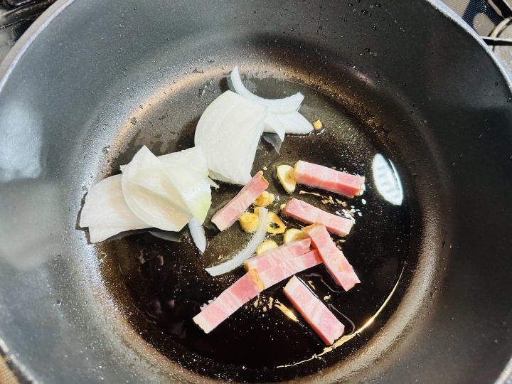 フライパンにオリーブオイルを入れニンニクが香りだし、カットしたベーコンとタマネギを炒める。