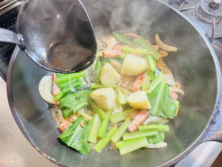 カットした小松菜を加えてさっと炒める。
