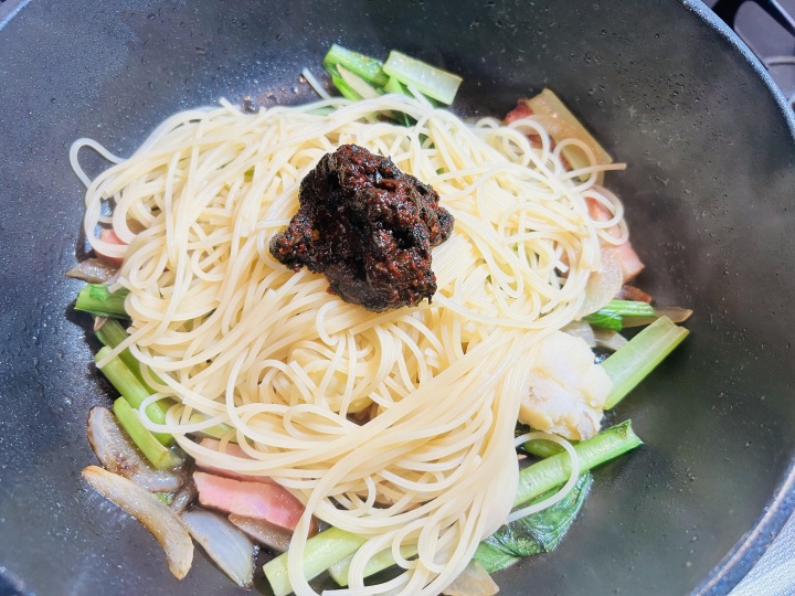 パスタのゆで汁も加えしっとりと仕上がるように。
