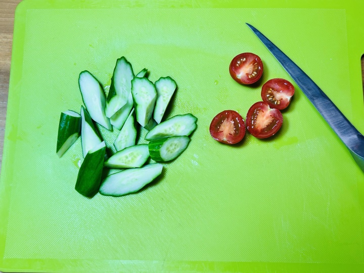 キュウリは大きめの乱切り、プチトマトは半分に切っておく。
