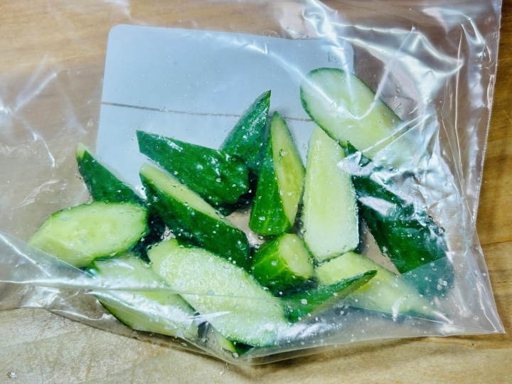ジップ袋にキュウリを入れ、塩を加え一分ほど揉み込む。