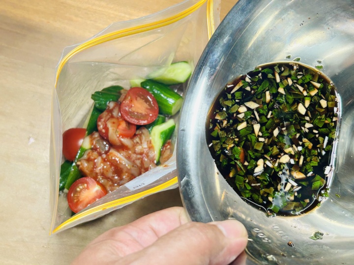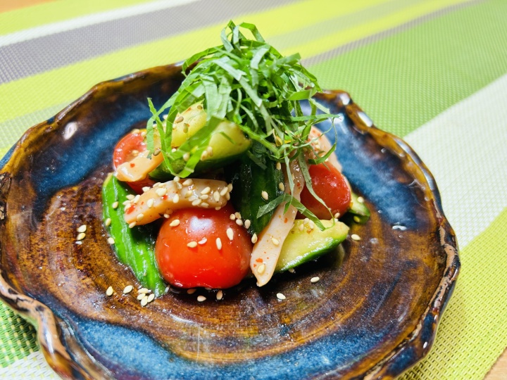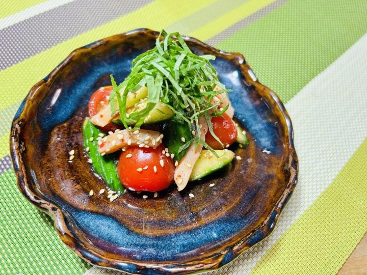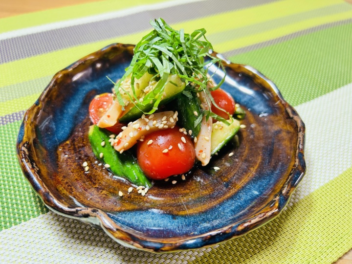 ボールでイカキムチ、トマト、醤油、バルサミコ酢、ハチミツ、ヴァージンオイルをよく混ぜておき、1へ加え軽く混ぜる。