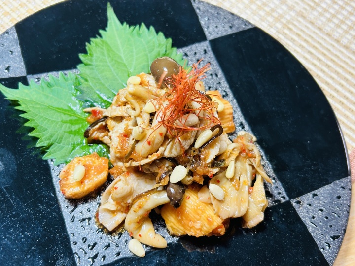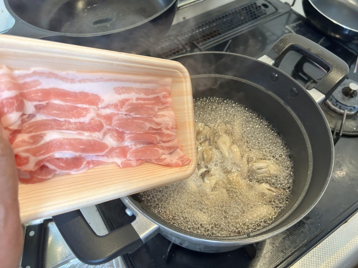 まずほぐしたキノコを加え一煮立ちさせ、豚バラを加えさっと火を通す。ザルにあげておく。