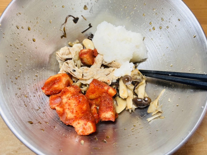 ボールへ1を入れて、醤油大さじ2、リンゴ酢、塩昆布を加えよく混ぜる。軽く水分を絞った大根おろし、胡麻油、山芋キムチを加え混ぜる。