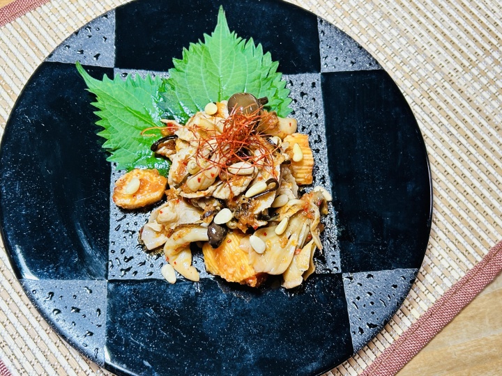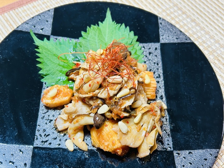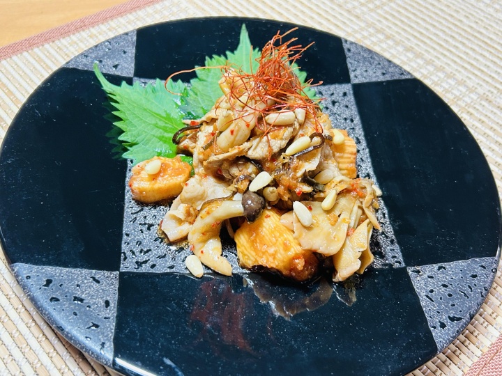 器に盛り、松の実(あれば)糸とうがらしを飾る。