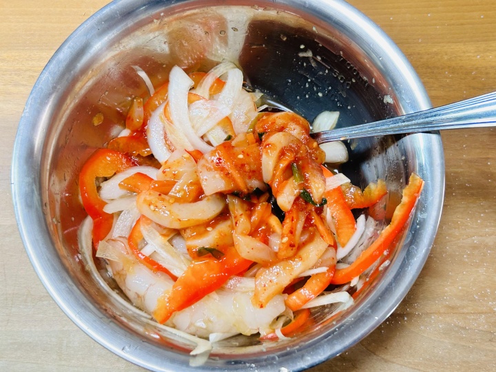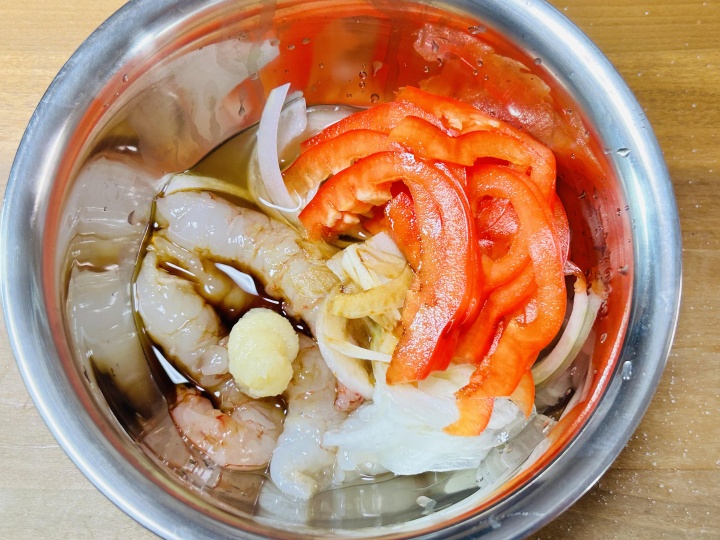 ボールに醤油、みりん、酒、おろし生姜、赤海老、切ったパプリカと玉ねぎを加え混ぜる。