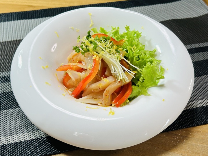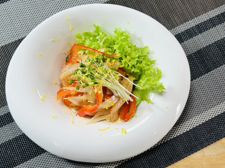 お好みの飾り野菜とお皿に盛り、おろしたレモンの皮を振る。