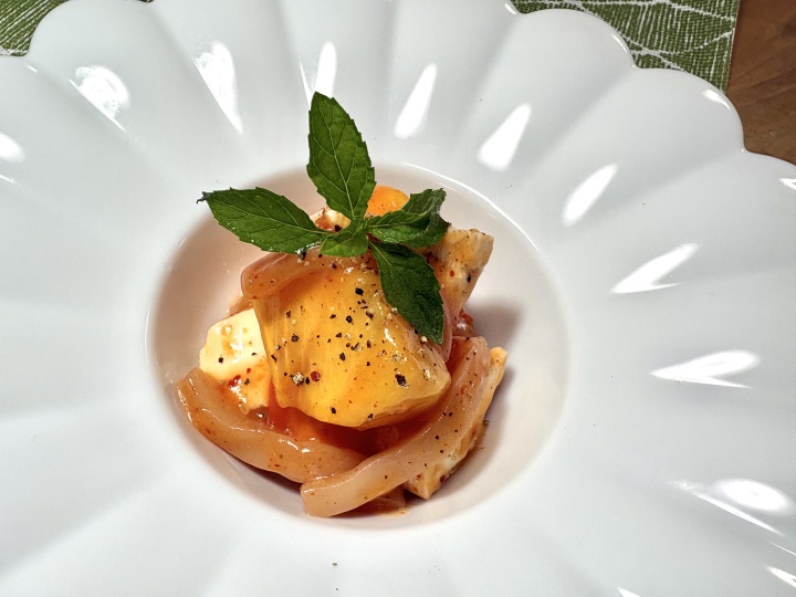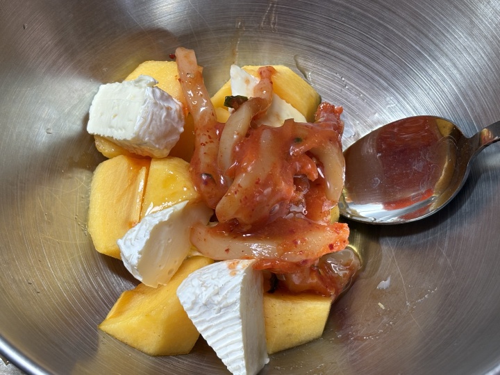 ボールへ1とイカキムチ、ヴァージンオイル、ジンを入れ良くあえる。