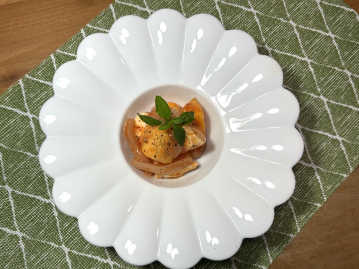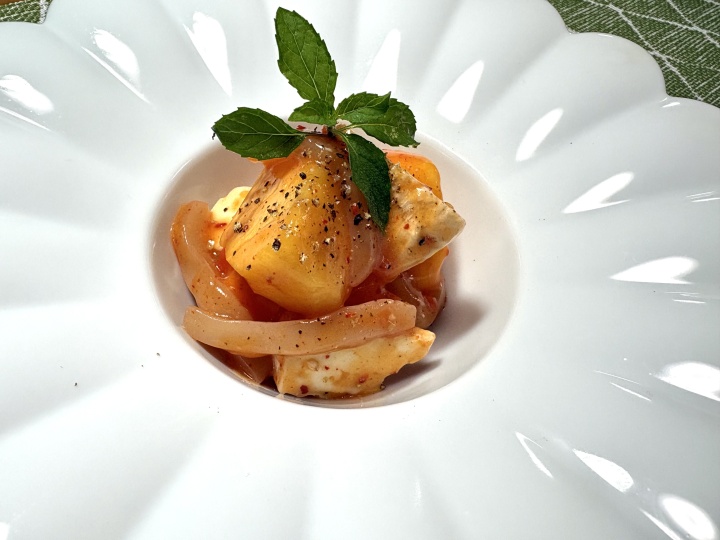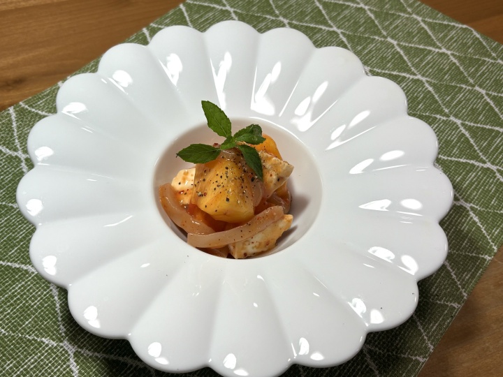 皿に盛り粗挽き黒胡椒をたっぷりかける。
