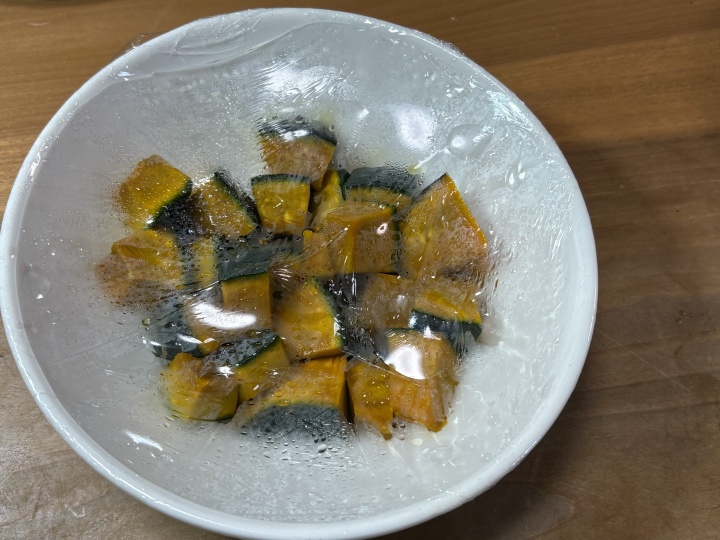 耐熱皿に乗せラップをし、レンジで5分ほど柔らかくなるまで火を入れる。