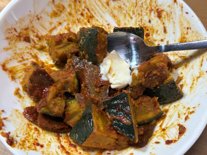 温かいうちに1へごぼうキムチ、ヴァージンオイル、マヨネーズ、松の実を入れる。