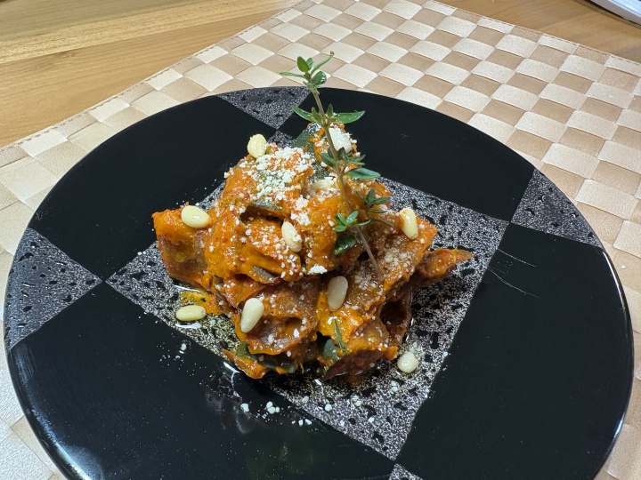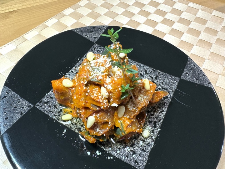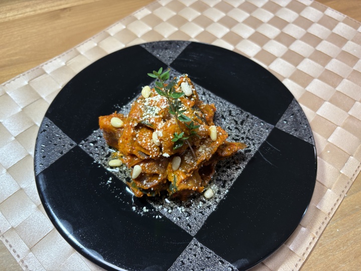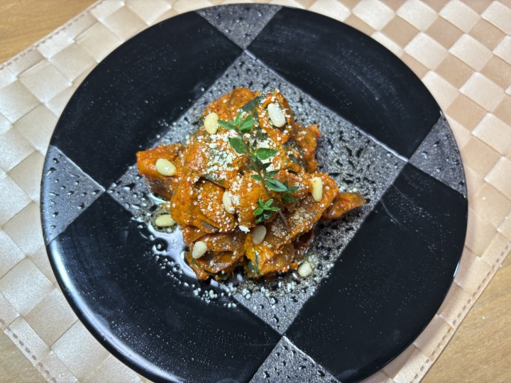皿に盛り、粉チーズ、ヴァージンオイルを振る。