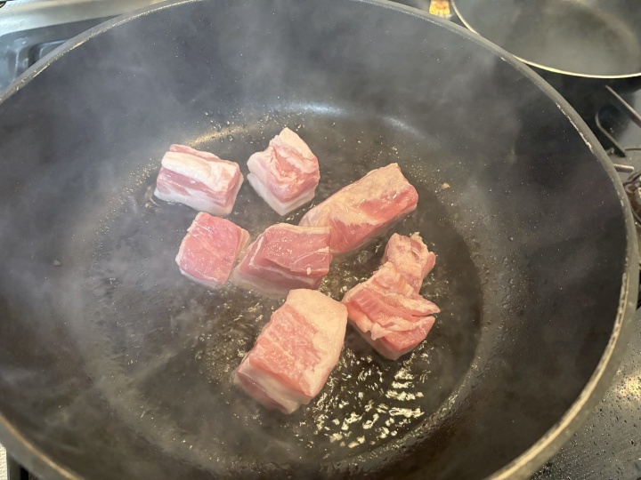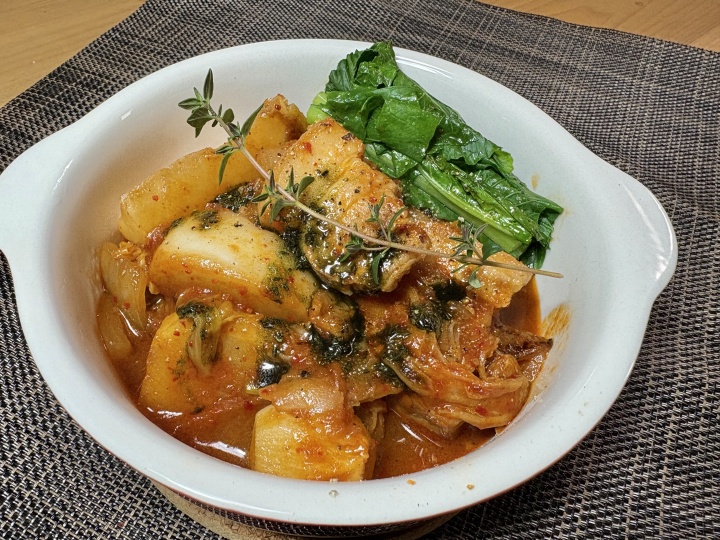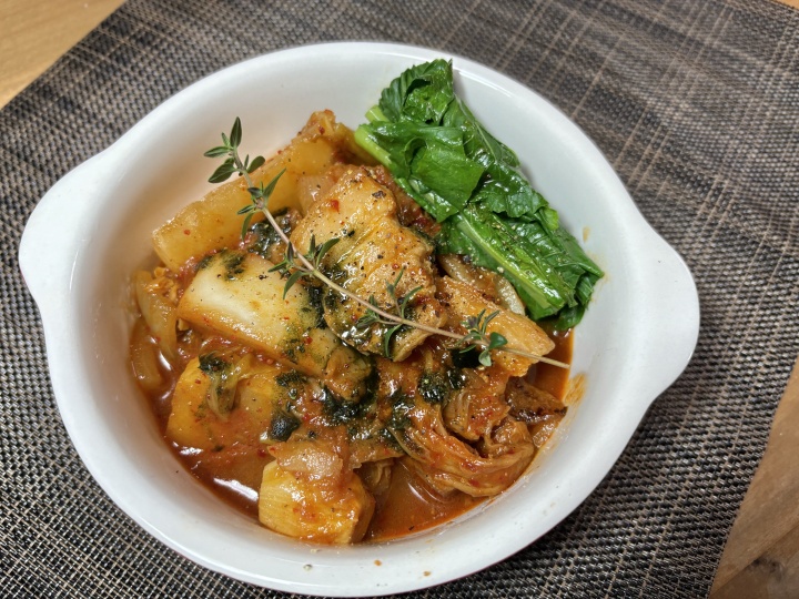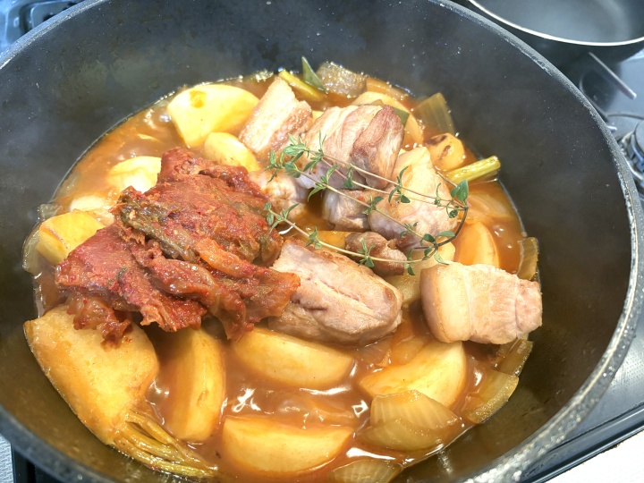 豚、白菜キムチを加え、蓋をせず味がなじむように5分ほど強火で煮る。