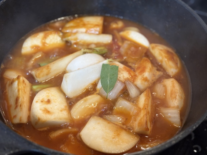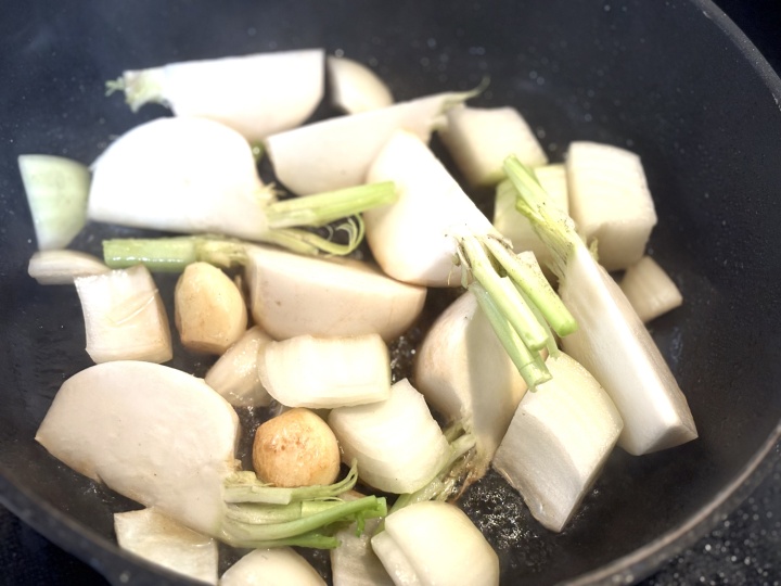1で使った鍋に潰したニンニク、玉ねぎ、かぶをソテー。