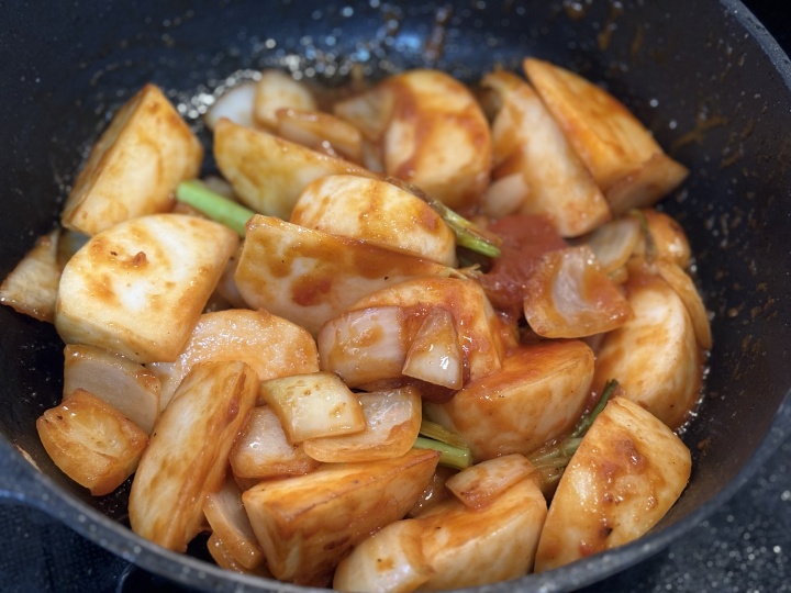 トマトソースを入れさらにソテー。酸味を飛ばす。