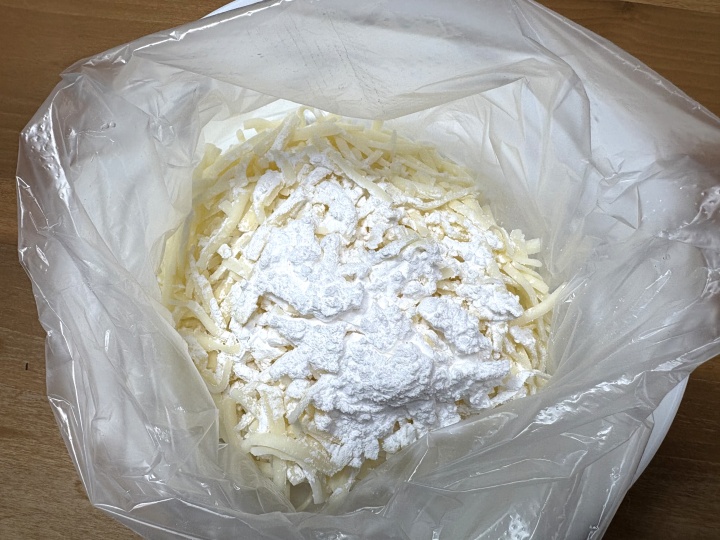 シュレットチーズにコーンスターチを良くまぶしておく。