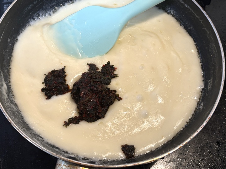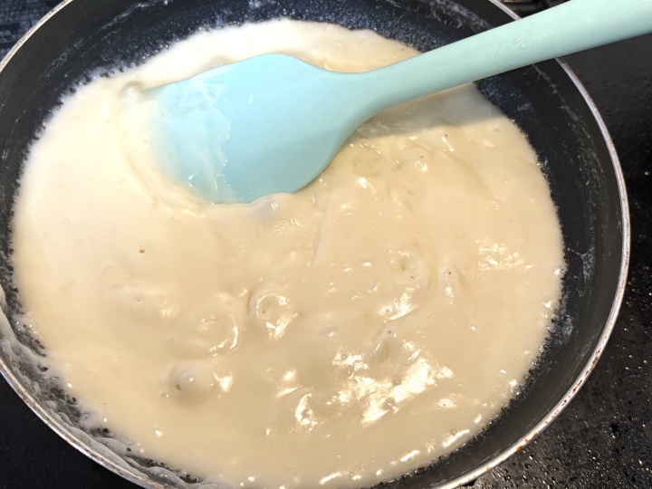 テフロンパンにチーズと牛乳を入れ、沸くまで火を入れる。