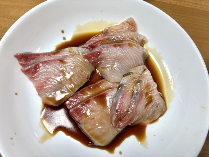 ブリは醤油にくぐらせておく。