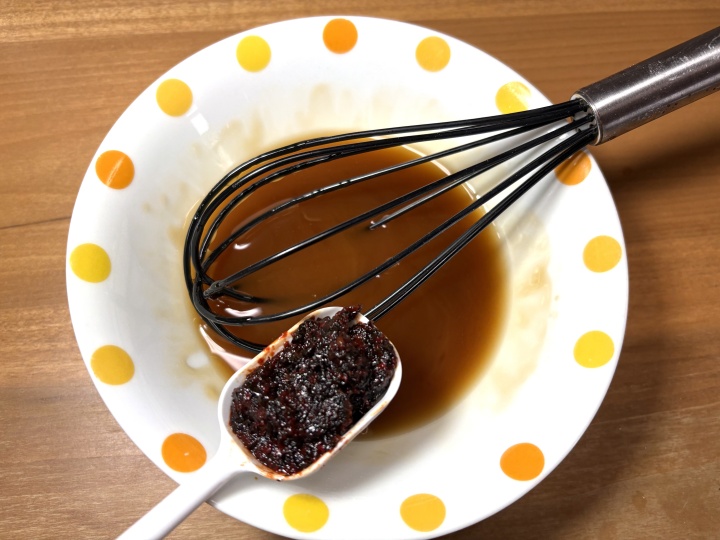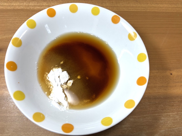 醤油、水、砂糖、コーンスターチを耐熱皿に入れ、よく混ぜる。