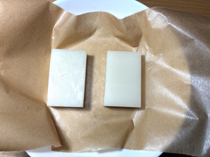 おもちをクッキングシートをひいた皿に乗せる。