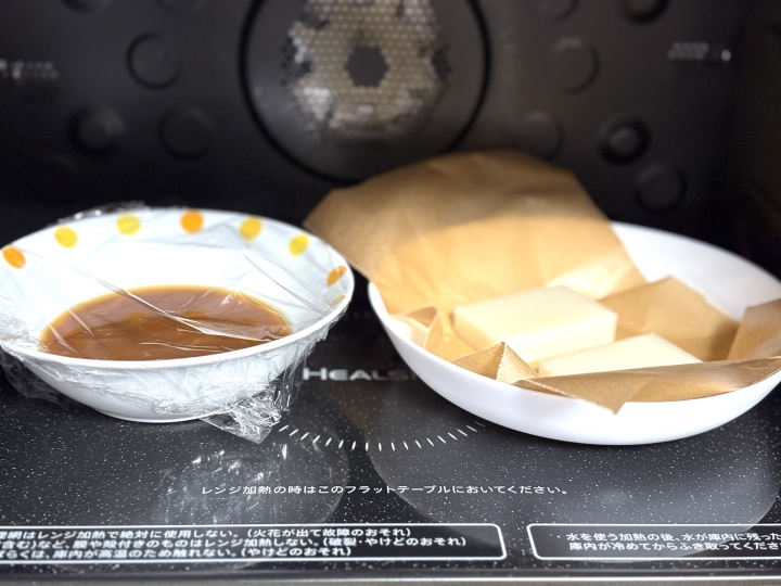 1と2を並べてレンジに入れ、2分~火が入るまで加熱する。