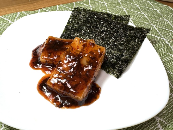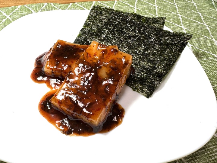 おもちをタレに絡めて海苔とともに皿に盛り付ける。