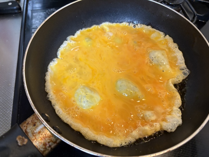 フライパンに多めのごま油、少し煙がたつくらいまで熱し、卵を入れてふわふわにミディアムに焼く。お皿に移しておく。