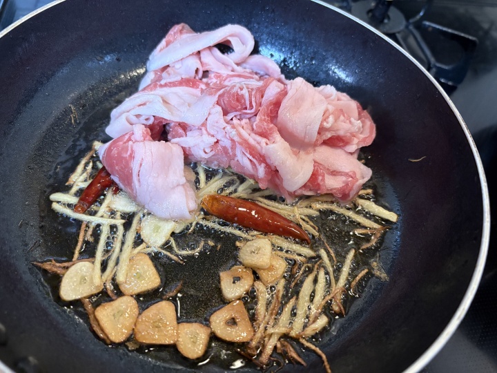2のフライパンにごま油、にんにく、鷹の爪、生姜を香りだし、豚肉を加えソテーする。また、トマトも加えてソテーする。