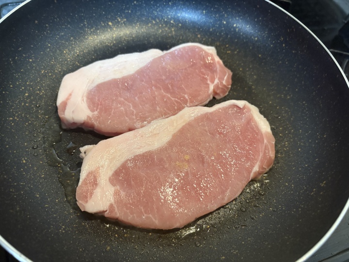 フライパンにサラダオイルを熱し、ポークを6分目ほど火が入る位に両面軽く焼く。