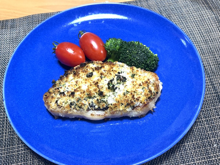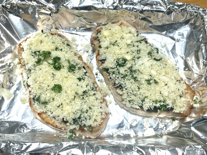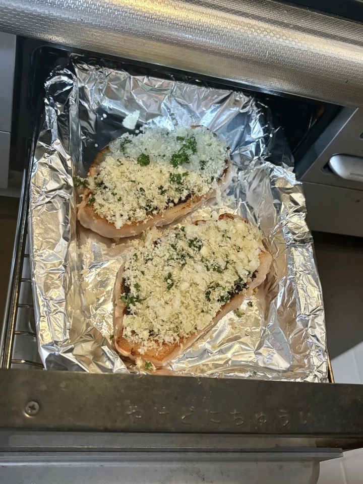 魚焼きロースターで中火で8分ほど、ゆっくりパン粉が色つくまで焼く。