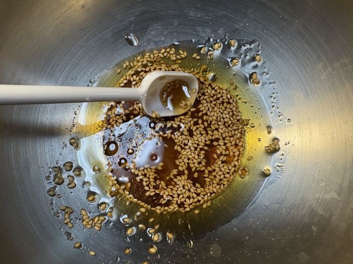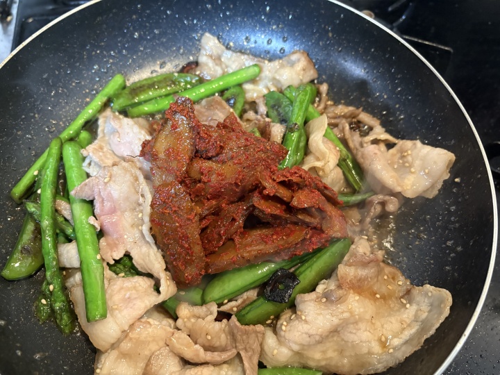 タレを加えて炒め合わせて、牛蒡キムチを加えサッと炒める。