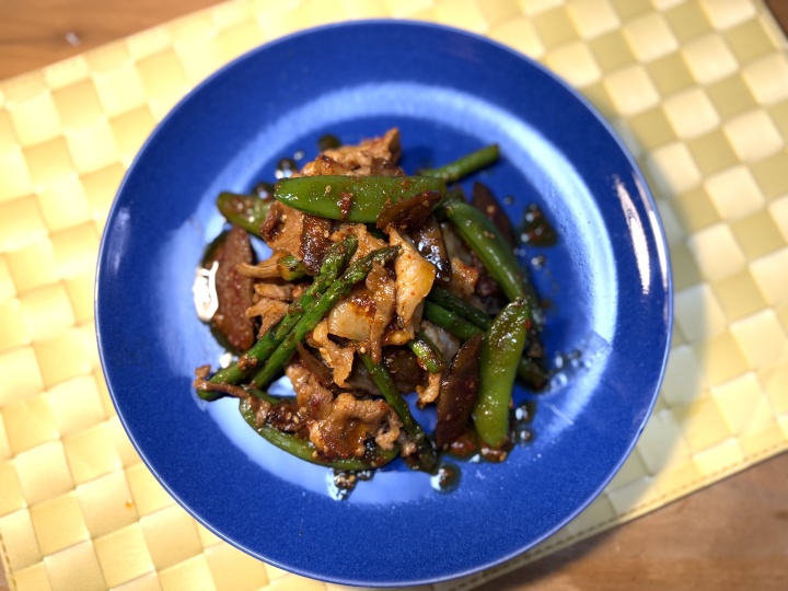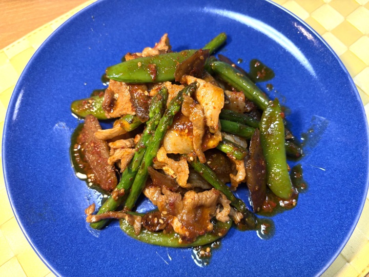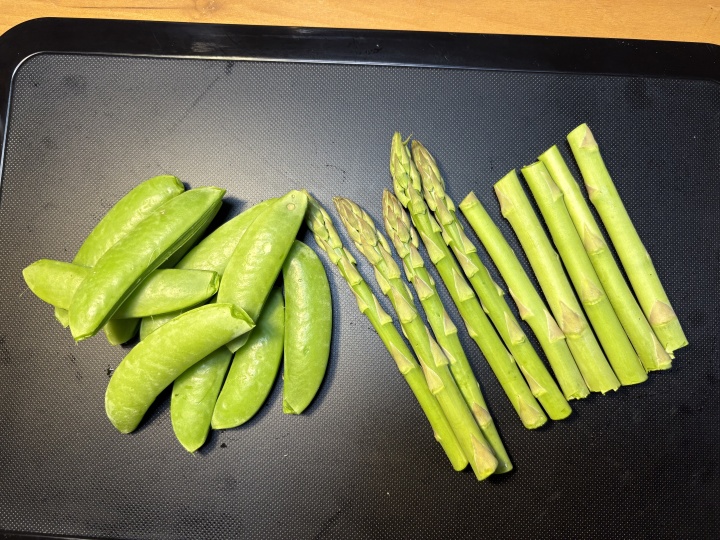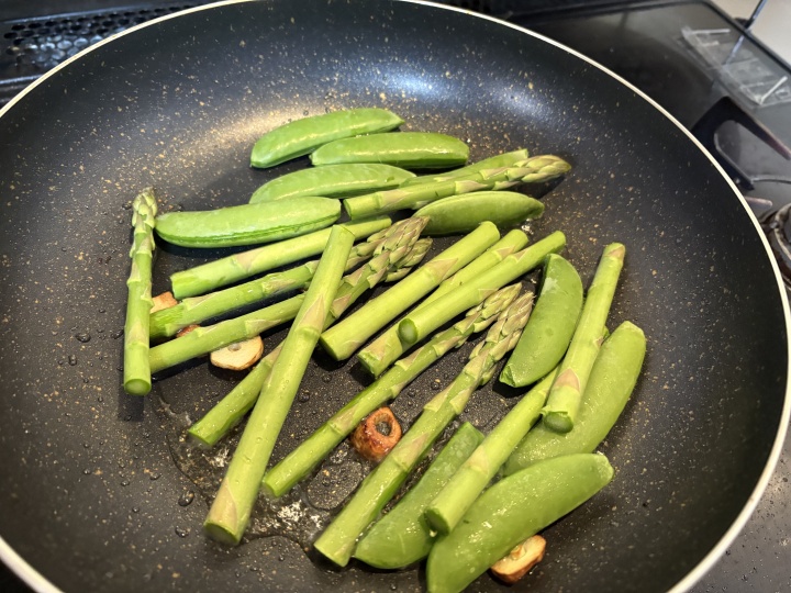 アスパラガスとスナップエンドウを加えて軽く炒める。