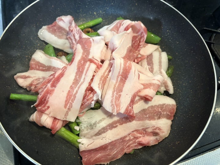 豚バラ肉を加えて軽く火が入るまで炒める。
