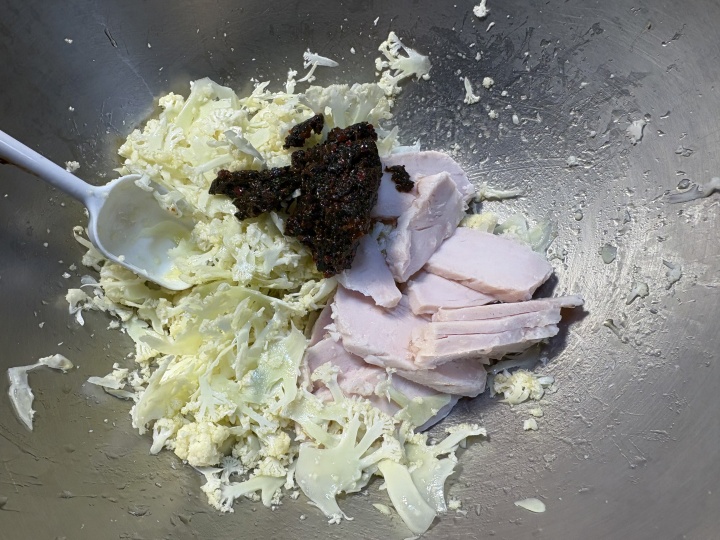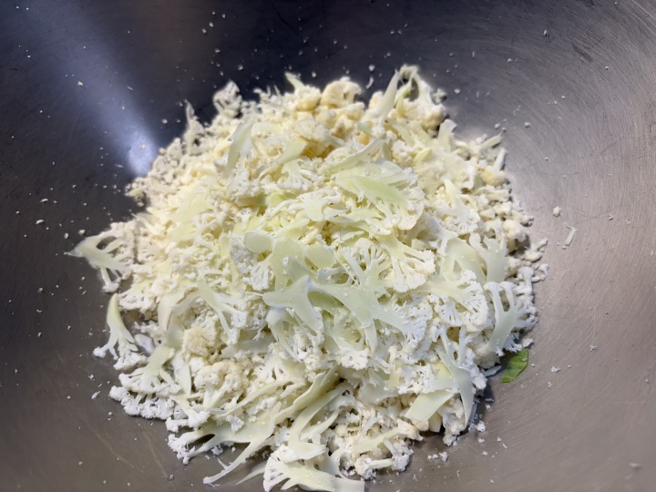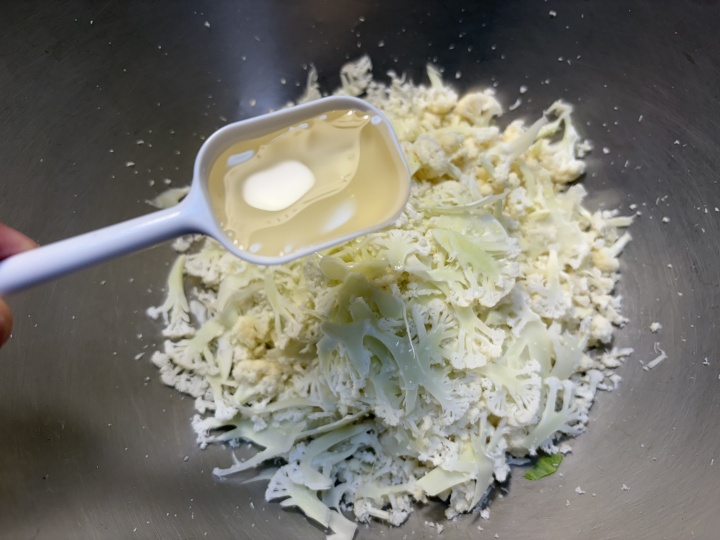 カリフラワーにリンゴ酢とヴァージン油を混ぜる。