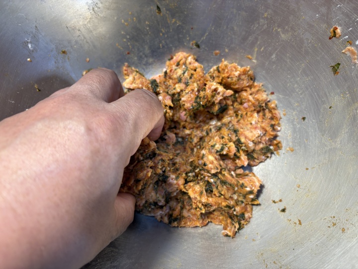 ボールでミンチ、大葉キムチ、おろしにんにく、コーンスターチをよく練る。