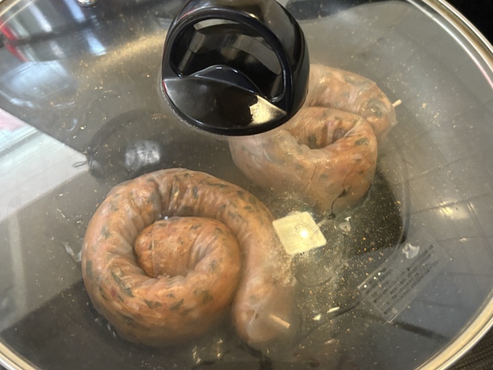 フライパンにサラダオイルをひき、チョリソーを入れ、蓋をして焼いていく。