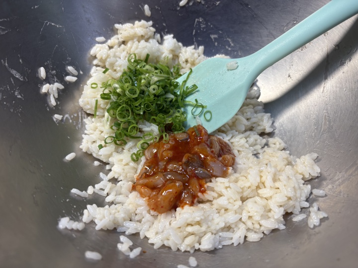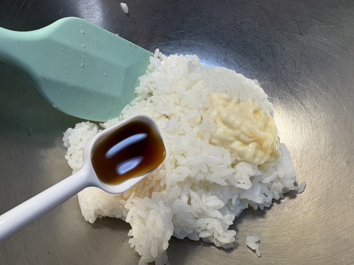 熱いご飯に、めんつゆ、マヨネーズをまずよく混ぜる。