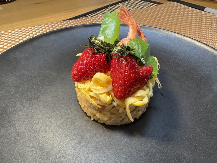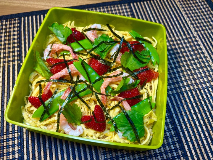 イチゴ、きぬさや、ボイル海老、三つ菜、切り海苔を飾る。