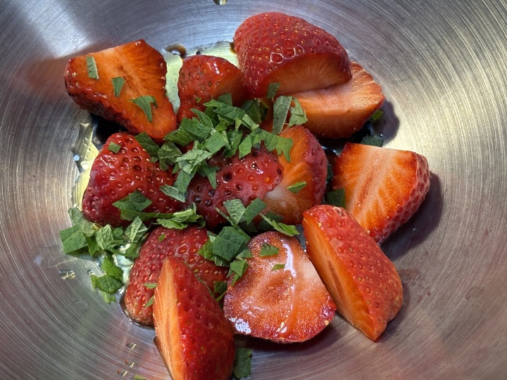 最初にバルサミコ、ヴァージンオイル、バジル(大葉)で和える。